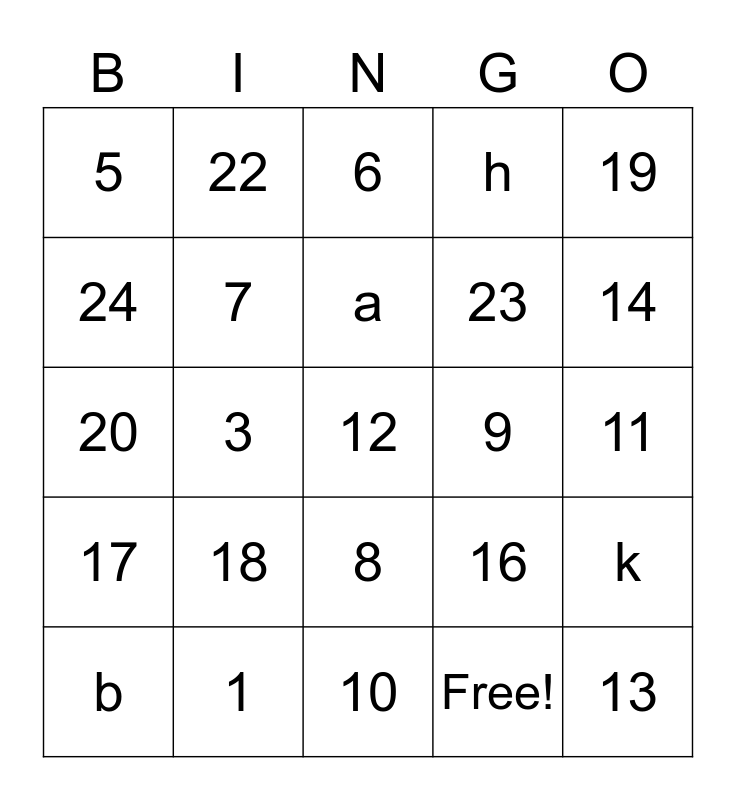 This bingo card has 30 words: 1, 2, 3, 4, 5, 6, 7, 8, 9, 10, 11, 12, Free!, 13, 14, 15, 16, 17, 18, 19, 20, 21, 22, 23, 24, h, k, b, a and y.
