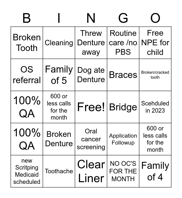 This bingo card has a free space and 24 words: Broken Denture, Toothache, Dog ate Denture, new Scritping Medicaid scheduled, Free NPE for child, Broken Tooth, OS referral, Cleaning, Bridge, Oral cancer screening, Braces, 100% QA, Application Followup, 600 or less calls for the month, Family of 5, NO OC'S FOR THE MONTH, Scehduled in 2023, Threw Denture away, Broken/cracked tooth, 600 or less calls for the month, Family of 4, 100% QA, Routine care /no PBS and Clear Liner.