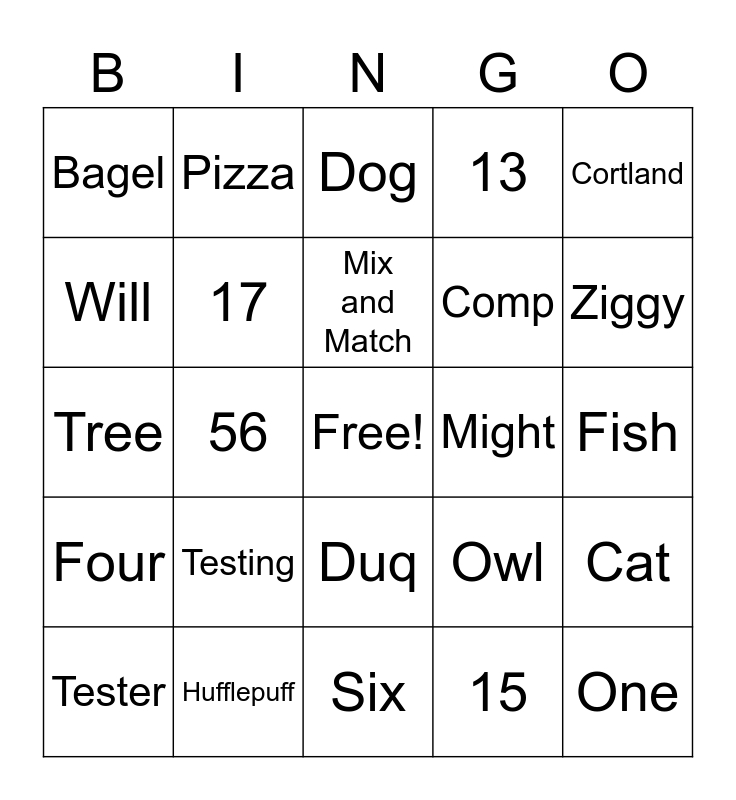 This bingo card has a free space and 24 words: Testing, Hufflepuff, Mix and Match, Tester, Cortland, Bagel, Will, Pizza, Might, Duq, Comp, Tree, Owl, Cat, 17, 15, Fish, Dog, Ziggy, 56, One, Four, 13 and Six.