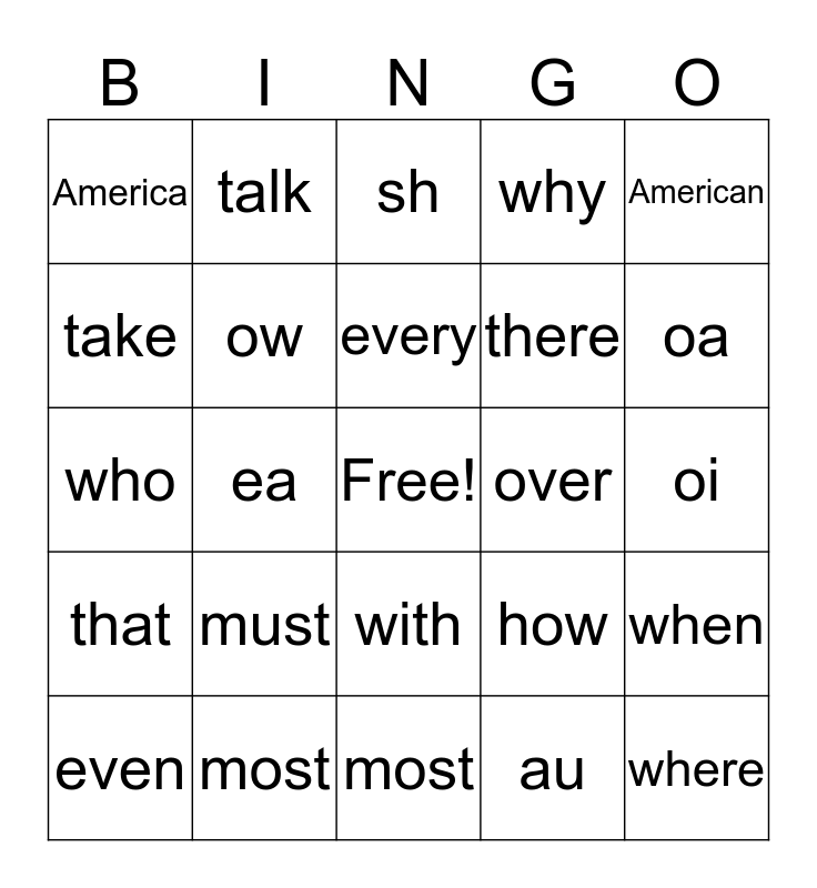 This bingo card has a free space and 24 words: must, most, every, even, American, America, take, talk, over, with, there, who, how, when, ow, au, oi, sh, oa, ea, where, that, why and most.