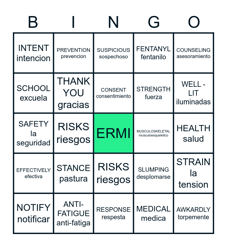 This bingo card has a free space and 54 words: ERGONOMICS ergonomica, STANCE pastura, MANAGED manejo, EXHALE exhala, STRAIN la tension, STRENOUS extenuantes, THANK YOU gracias, LIMITATIONS limitaciones, FENTANYL fentanilo, SOFT lesiones, INTENT intencion, HALF HOUR media hora, CHAMP campeone, AWKARDLY torpemente, EPICONDYLITIS epicondiitis, HOIST polipastos, CONSENT consentimiento, MUSCULOSKELETAL musculoesqueletico, WORKPLACE trabajo, SAFETY la seguridad, ANTI-FATIGUE anti-fatiga, OPIODS opioides, SLUMPING desplomarse, WELL - LIT iluminadas, TRAINED entrenada, PREVENTION prevencion, ALONE solo, REPRESNTATIVE representative, EFFECTIVELY efectiva, RISKS riesgos, NERVE nervio, NOTIFY notificar, EMPLOYER empleadora, HELPLINE, COUNSELING asesoramiento, REPORT reporte, SUSPICIOUS sospechoso, MEDICAL medica, PHYSICIAN medicamento, SCHOOL excuela, HARMFUL danina, RESPONSIBILITY responsabilidad, COMMUNICATE comunicar, POSITIVE positiva, RESPONSE respesta, OXYGEN oxigeno, TIMING momento, SCHEDULE calendario, STRENGTH fuerza, HEALTH salud, RISKS riesgos, REPONSIBILITY responsabilidad, EXERCISE ejercicio and REGULATION regulacion.