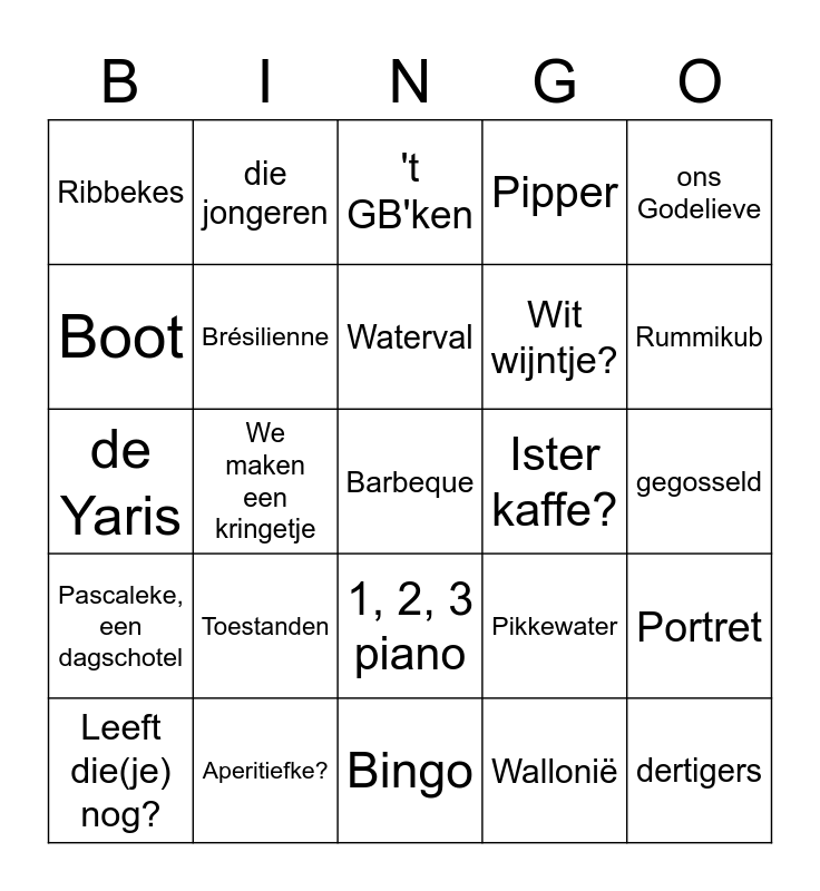 This bingo card has a free space and 24 words: Toestanden, Aperitiefke?, Waterval, Leeft die(je) nog?, ons Godelieve, Ribbekes, Boot, die jongeren, Ister kaffe?, 1, 2, 3 piano, Wit wijntje?, de Yaris, Pikkewater, Portret, Brésilienne, Wallonië, gegosseld, 't GB'ken, Rummikub, We maken een kringetje, dertigers, Pascaleke, een dagschotel, Pipper and Bingo.