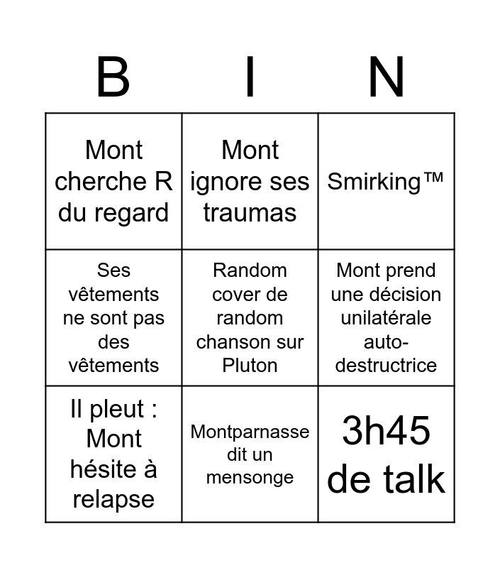 This bingo card has 9 words: Il pleut : Mont hésite à relapse, Smirking™, Mont ignore ses traumas, Ses vêtements ne sont pas des vêtements, Mont cherche R du regard, Mont prend une décision unilatérale auto-destructrice, Random cover de random chanson sur Pluton, 3h45 de talk and Montparnasse dit un mensonge.