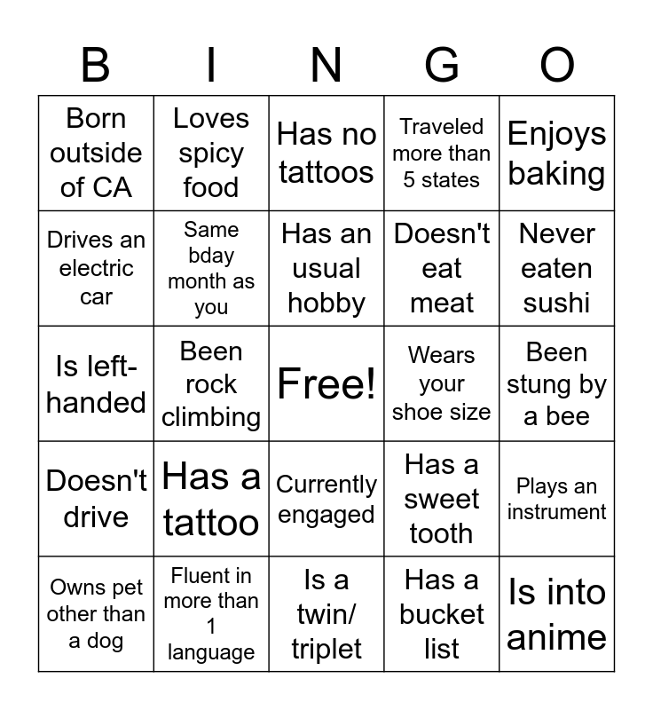 This bingo card has a free space and 24 words: Has a tattoo, Fluent in more than 1 language, Has an usual hobby, Owns pet other than a dog, Enjoys baking, Born outside of CA, Drives an electric car, Loves spicy food, Wears your shoe size, Currently engaged, Doesn't eat meat, Is left-handed, Has a sweet tooth, Plays an instrument, Same bday month as you, Has a bucket list, Been stung by a bee, Has no tattoos, Never eaten sushi, Been rock climbing, Is into anime, Doesn't drive, Traveled more than 5 states and Is a twin/ triplet.