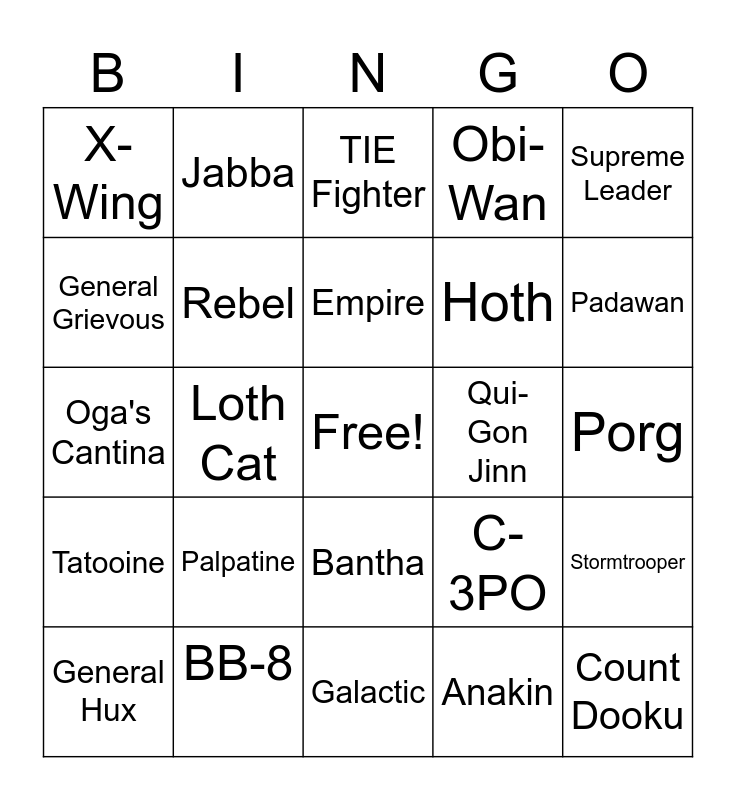 This bingo card has a free space and 69 words: LightSaber, Porg, t-16 Skyhopper, DeathStar, BB-8, Darth Vader, Obi-Wan, Jedi, Supreme Leader, Sith, Stormtrooper, Kylo Ren, X-Wing, TIE Fighter, Jakku Speeder, Loth Cat, Bantha, Hoth, Naboo, Tatooine, Qui-Gon Jinn, C-3PO, Padawan, Clones, Luke Skywalker, Princess Leia, R2D2, Rey, Anakin, Yoda, Jabba, Boba Fett, Light Speed, Blaster, Han Solo, Wookie, Ewoks, Galaxy's Edge, General Grievous, Darth Maul, Palpatine, Count Dooku, Mace Windu, Padme Amadala, Sandworm, General Hux, Droid, The Force, The Darkside, Rebel, Empire, First Order, Alliance, Galactic, Chewbacca, Lando, Mandolorian, Baby Yoda, Blue Milk, Oga's Cantina, Sabacc, Coruscant, Mustafar, Kamino, Alderaan, Dagobah, Jawas, Blurrg and Wampa.