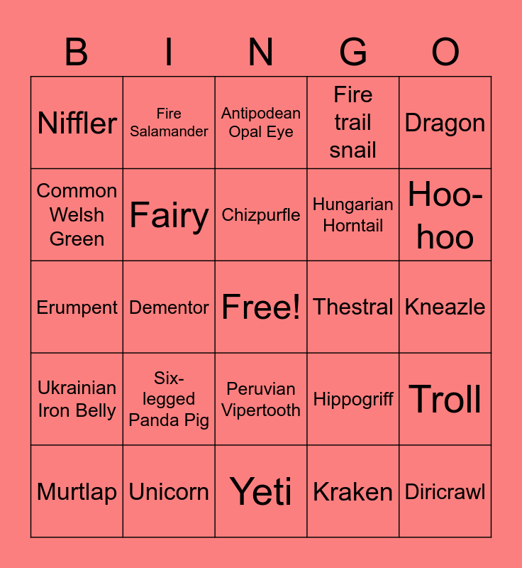 This bingo card has a free space and 75 words: Abraxan, Acromantula, Antipodean Opal Eye, Badger, Basilisk, Bigfoot, Blast ended skrewt, Bowtruckle, Briarluxe, Catalonian Fireball, Chicken, Chinese Fireball, Chizpurfle, Common Welsh Green, Crup, Dementor, Demiguise, Diricrawl, Doxy, Dragon, Eagle, Erumpent, Fairy, Fire Salamander, Fire trail snail, Flesh eating slug, Frost Salamander, Fwooper, Ghoul, Giant Squid, Gnome, Grindylow, Herbridean Black, Hippogriff, Hoo-hoo, Hungarian Horntail, Jackalope, Kelpie, Kneazle, Kraken, Lethifold, Lion, Manticore, Matagot, Merpeople, Mooncalf, Murtlap, Niffler, Norwegian Ridgeback, Nundu, Occamy, Peruvian Vipertooth, Pheonix, Plague Rat, Porlock, Puffskein, Qilin, Romanian Longhorn, Rooster, Sea Serpent, Six-legged Panda Pig, Snake, Snallygaster, Sphinx, Swooping Evil, Thestral, Three Headed Dog, Thunderbird, Toad, Troll, Ukrainian Iron Belly, Unicorn, Werewolf, Yeti and Zouwu.