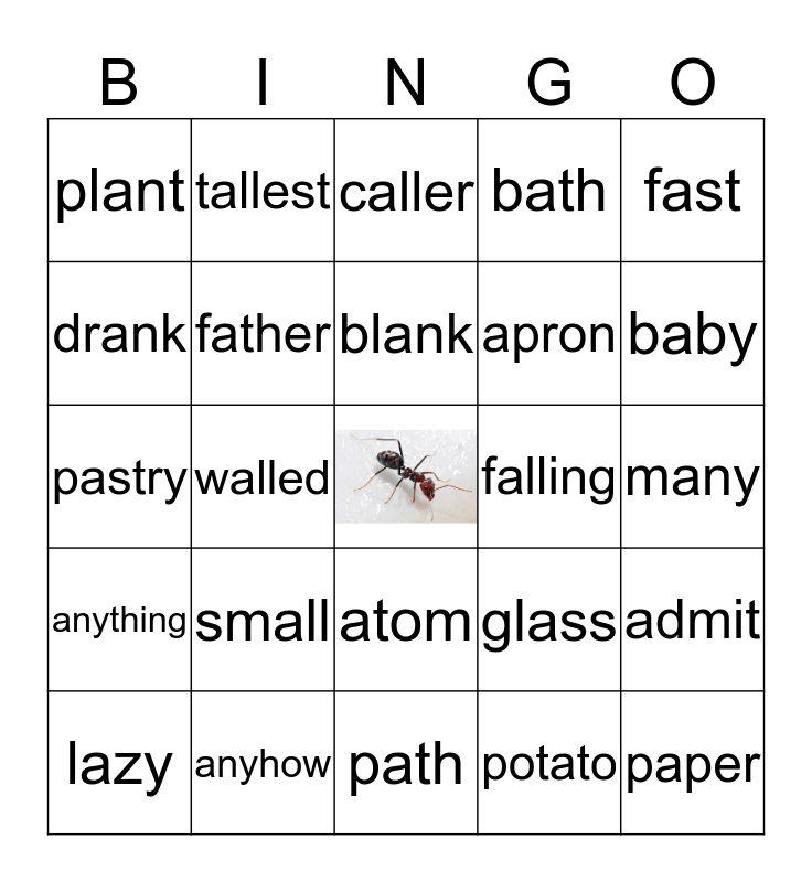 This bingo card has a free space and 24 words: small, anyhow, blank, lazy, fast, plant, drank, tallest, falling, atom, apron, pastry, glass, admit, father, potato, many, caller, baby, walled, paper, anything, bath and path.