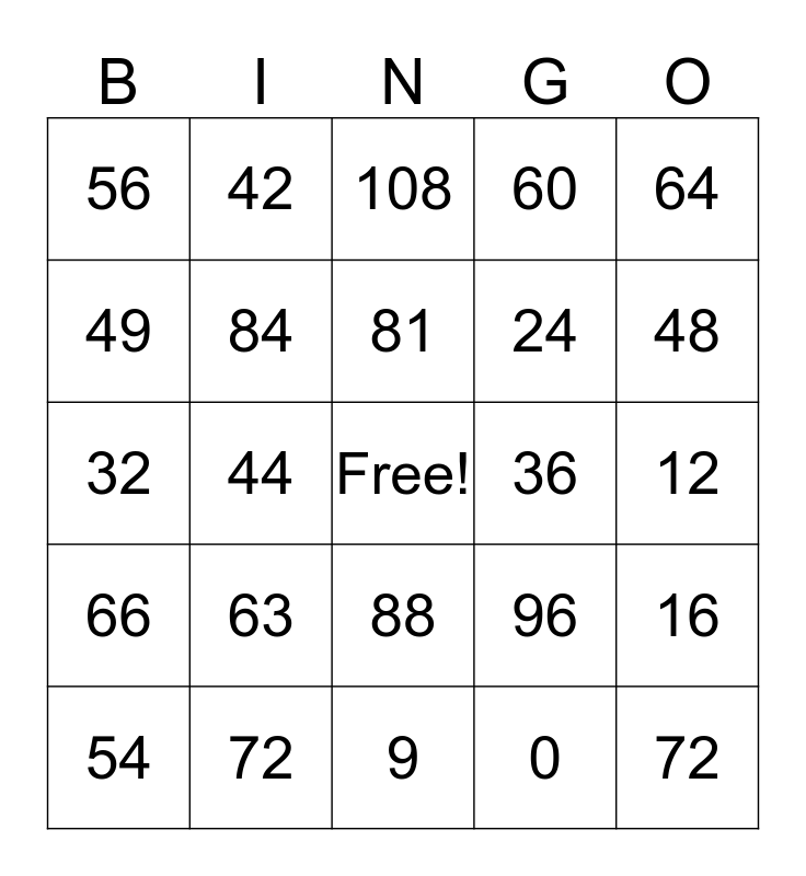 This bingo card has a free space and 24 words: 63, 72, 81, 54, 64, 56, 49, 42, 36, 88, 24, 32, 96, 16, 84, 0, 12, 108, 48, 44, 72, 66, 60 and 9.