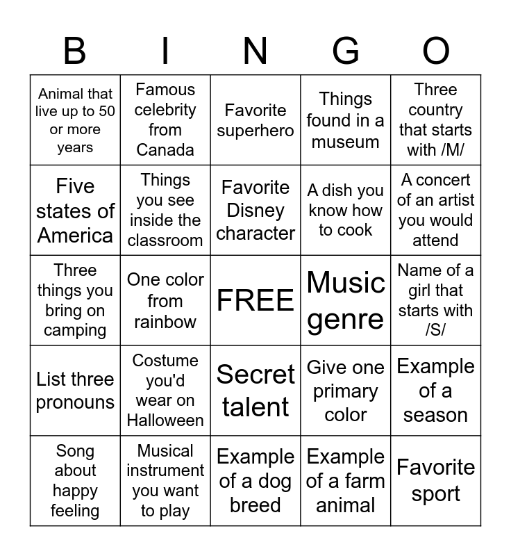 This bingo card has a free space and 24 words: Costume you'd wear on Halloween, Musical instrument you want to play, Favorite Disney character, Song about happy feeling, Three country that starts with /M/, Animal that live up to 50 or more years, Five states of America, Famous celebrity from Canada, Music genre, Secret talent, A dish you know how to cook, Three things you bring on camping, Give one primary color, Example of a season, Things you see inside the classroom, Example of a farm animal, Name of a girl that starts with /S/, Favorite superhero, A concert of an artist you would attend, One color from rainbow, Favorite sport, List three pronouns, Things found in a museum and Example of a dog breed.