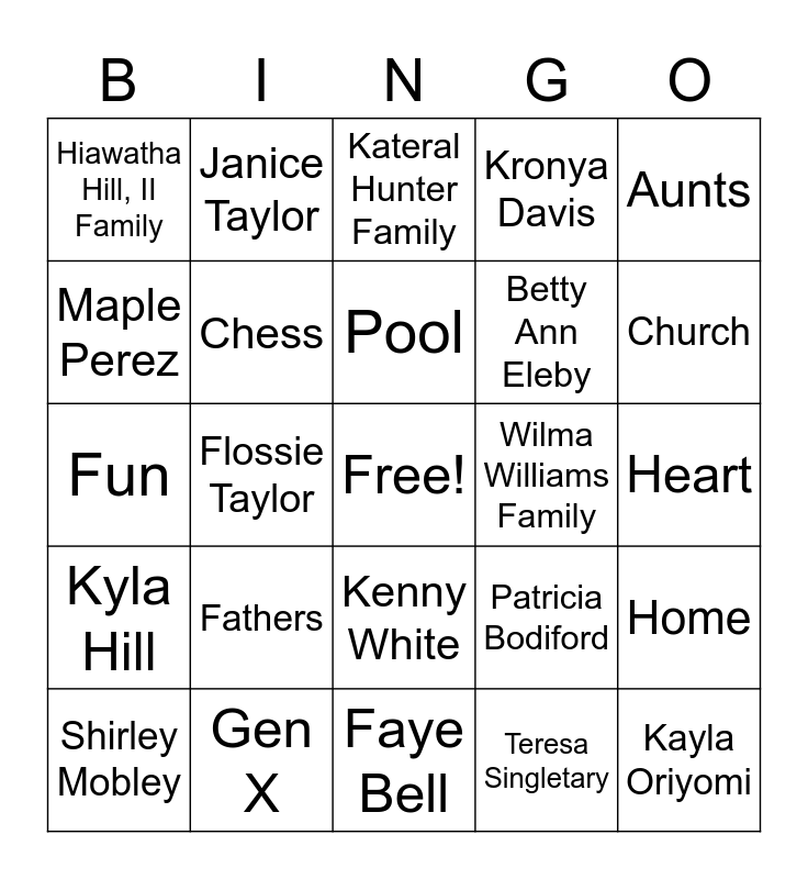 This bingo card has a free space and 24 words: Fathers, Gen X, Pool, Shirley Mobley, Aunts, Hiawatha Hill, II Family, Maple Perez, Janice Taylor, Wilma Williams Family, Kenny White, Betty Ann Eleby, Fun, Patricia Bodiford, Home, Chess, Teresa Singletary, Heart, Kateral Hunter Family, Church, Flossie Taylor, Kayla Oriyomi, Kyla Hill, Kronya Davis and Faye Bell.