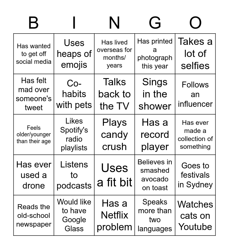 This bingo card has 25 words: Listens to podcasts, Has a Netflix problem, Talks back to the TV, Reads the old-school newspaper, Takes a lot of selfies, Has wanted to get off social media, Has felt mad over someone's tweet, Uses heaps of emojis, Has a record player, Uses a fit bit, Sings in the shower, Feels older/younger than their age, Believes in smashed avocado on toast, Goes to festivals in Sydney, Co-habits with pets, Watches cats on Youtube, Has ever made a collection of something, Has lived overseas for months/ years, Follows an influencer, Likes Spotify's radio playlists, Plays candy crush, Would like to have Google Glass, Has ever used a drone, Has printed a photograph this year and Speaks more than two languages.