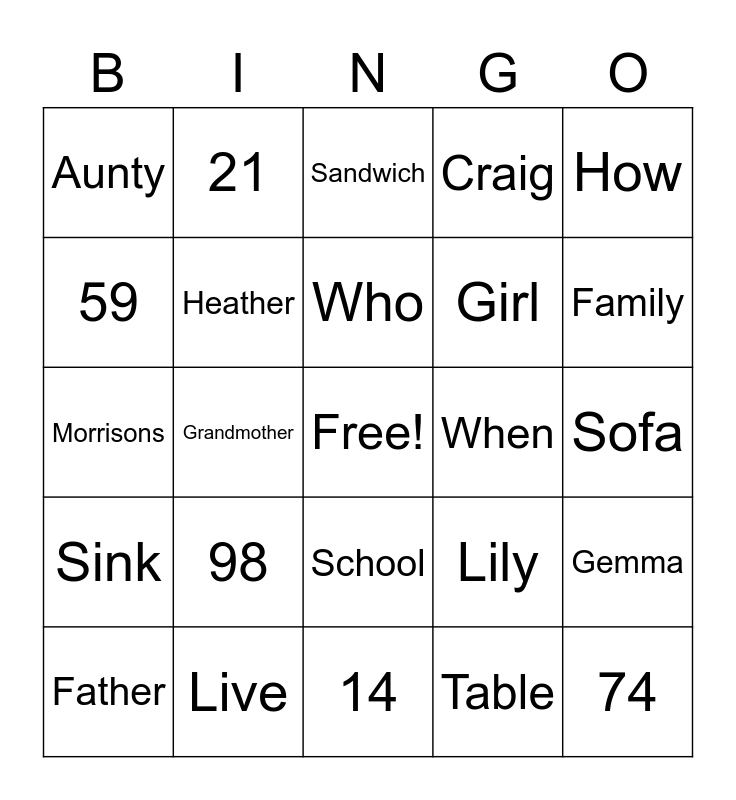 This bingo card has a free space and 51 words: 74 56 14 98 100 21 83 59 Sophie Heather Craig Gemma Lily What Where Who When Why How Grandmother Table Aunty Girl Son Sister Family Children Father Sandwich Brother Cupboard, 74, 56, 14, 98, 100, 21, 83, 59, Sophie, Heather, Craig, Gemma, Lily, What, Where, Who, When, Why, How, Grandmother, Table, Aunty, Girl, Son, Sister, Family, Children, Father, Sandwich, Brother, Cupboard, Deaf, Hearing, How old, Live, Name, How many, Born, Freezer, Sofa, Sink, Breakfast, Reading, Roundabout, Tesco, Morrisons, Abseiling, Tennis, School and Hospital.
