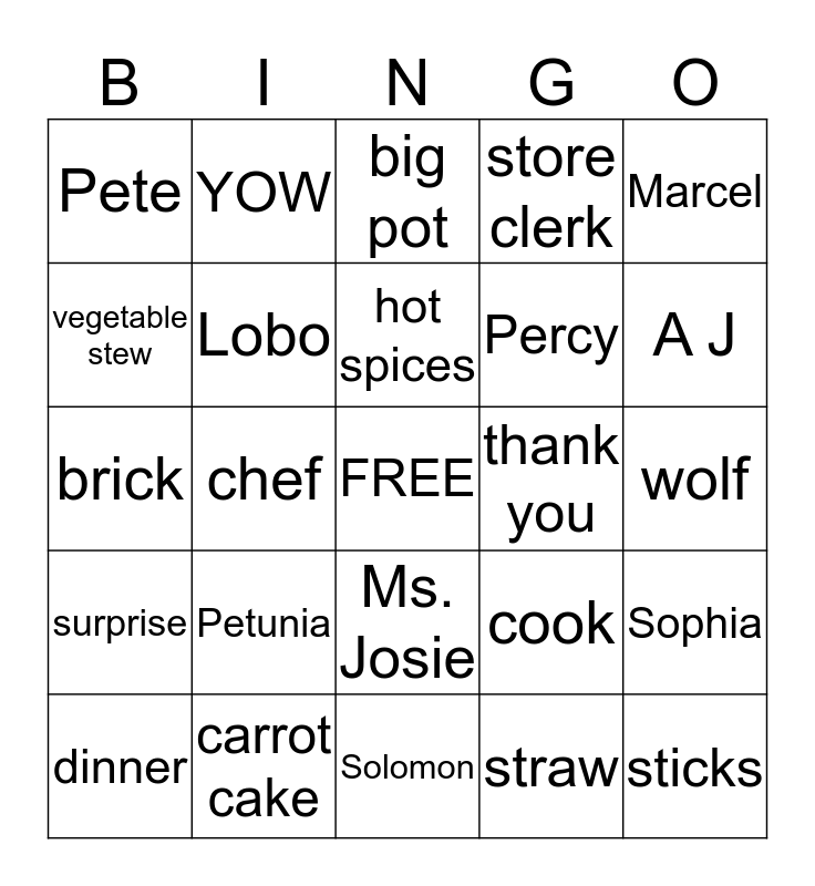This bingo card has a free space and 24 words: Petunia, carrot cake, hot spices, dinner, Marcel, Pete, vegetable stew, YOW, thank you, Ms. Josie, Percy, brick, cook, Sophia, Lobo, straw, wolf, big pot, A J, chef, sticks, surprise, store clerk and Solomon.