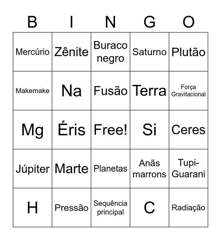 This bingo card has a free space and 63 words: Babilônicos, Incas, Chineses, Tupi-Guarani, Asterismo, Constelação, Zênite, Eclíptica, Fusão, Fissão, Planetas, Planeta-anões, Ceres, Plutão, Haumea, Makemake, Éris, Mercúrio, Vênus, Terra, Marte, Júpiter, Saturno, Urano, Netuno, Planetas Telúricos, Planetas Terrestres, Planetas Internos, Planetas Externos, Satétlite, Ganimedes, Titã, Meio interestelar, Nebulosa, Força Gravitacional, H, He, C, O, Na, Mg, Si, S, Fe, Radiação, Pressão, Supernova, Anãs marrons, Anã branca, Protoestrela, Pré-sequência principal, Sequência principal, Estágio final, Gigante vermelha, Estrela de Nêutrons, Buraco negro, Ano-Luz, Parsec, Galáxia, Via Láctea, Braço de Órion, Galáxia de Andrômeda and Sistema Solar.