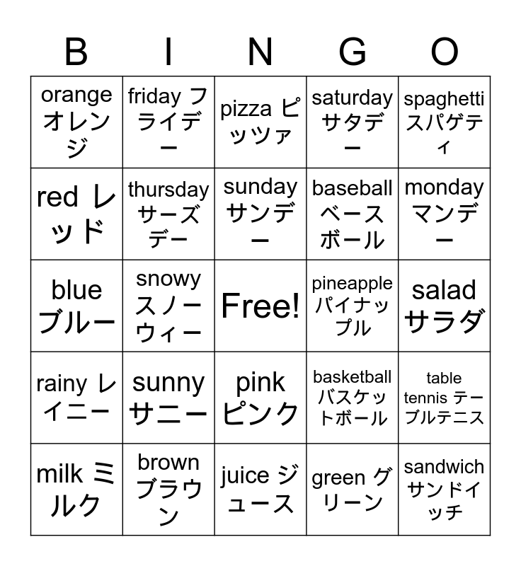 This bingo card has a free space and 37 words: yellow イエロー, wednesday ウェンズデー, tuesday チューズデー, thursday サーズデー, table tennis テーブルテニス, sunny サニー, sunday サンデー, strawberry ストロベリー, spaghetti スパゲティ, soccer サッカー, snowy スノーウィー, saturday サタデー, sandwich サンドイッチ, salad サラダ, red レッド, rainy レイニー, purple パープル, pizza ピッツァ, pink ピンク, pineapple パイナップル, orangeオレンジ, monday マンデー, milk ミルク, juice ジュース, ice cream アイスクリーム, green グリーン, friday フライデー, fish フィッシュ, dodgeball ドッジボール, cloudy クラウディー, cherry チェリー, brown ブラウン, blue ブルー, black ブラック, basketball バスケットボール, baseball ベースボール and banana バナナ.