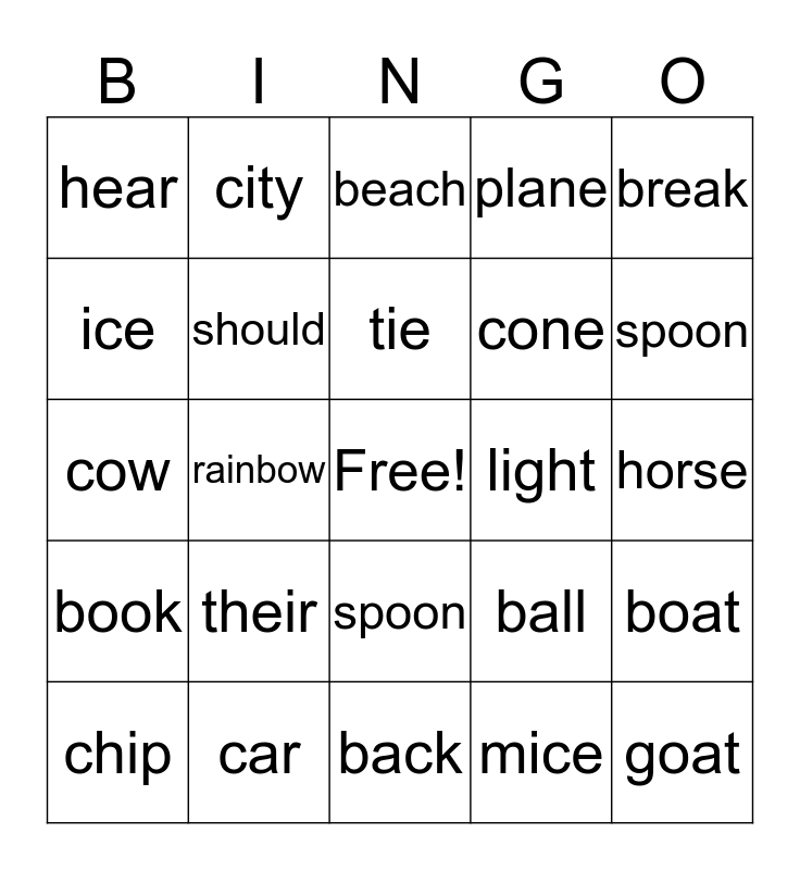 This bingo card has a free space and 24 words: their, car, tie, chip, break, hear, ice, city, light, spoon, cone, cow, ball, boat, should, mice, horse, beach, spoon, rainbow, goat, book, plane and back.