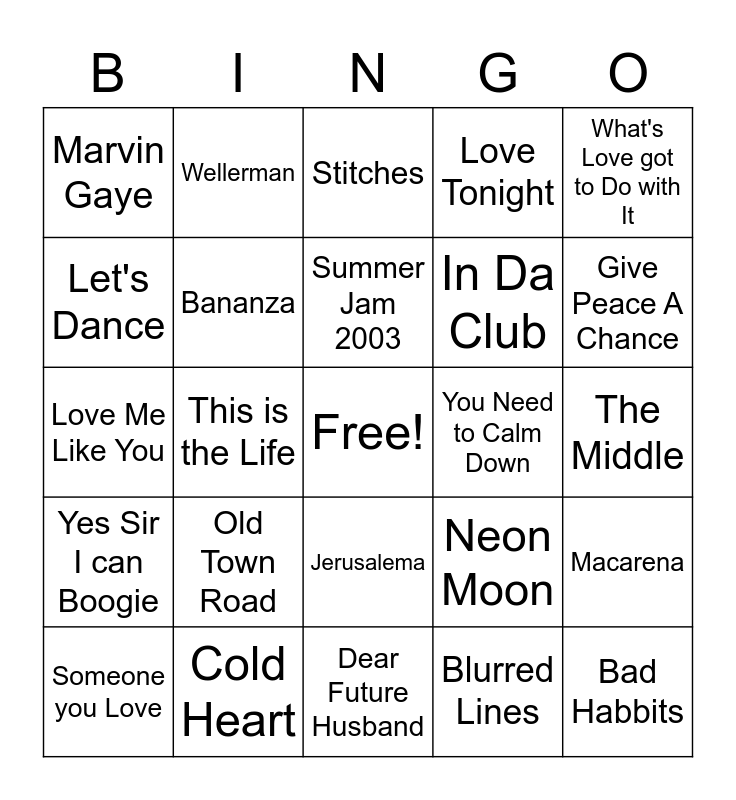 This bingo card has a free space and 29 words: Someone you Love, Drunken Sailor, This is the Life, Cat's in the Cradle, Marvin Gaye, Stitches, Bananza, Old Town Road, You Need to Calm Down, Cold Heart, The Middle, Bad Habbits, Dear Future Husband, Blurred Lines, Give Peace A Chance, Homely Girl, Jerusalema, Yes Sir I can Boogie, What's Love got to Do with It, Love Me Like You, Neon Moon, Cry To Me, In Da Club, Let's Dance, Love Tonight, Wellerman, Macarena, Summer Jam 2003 and The Final Countdown.