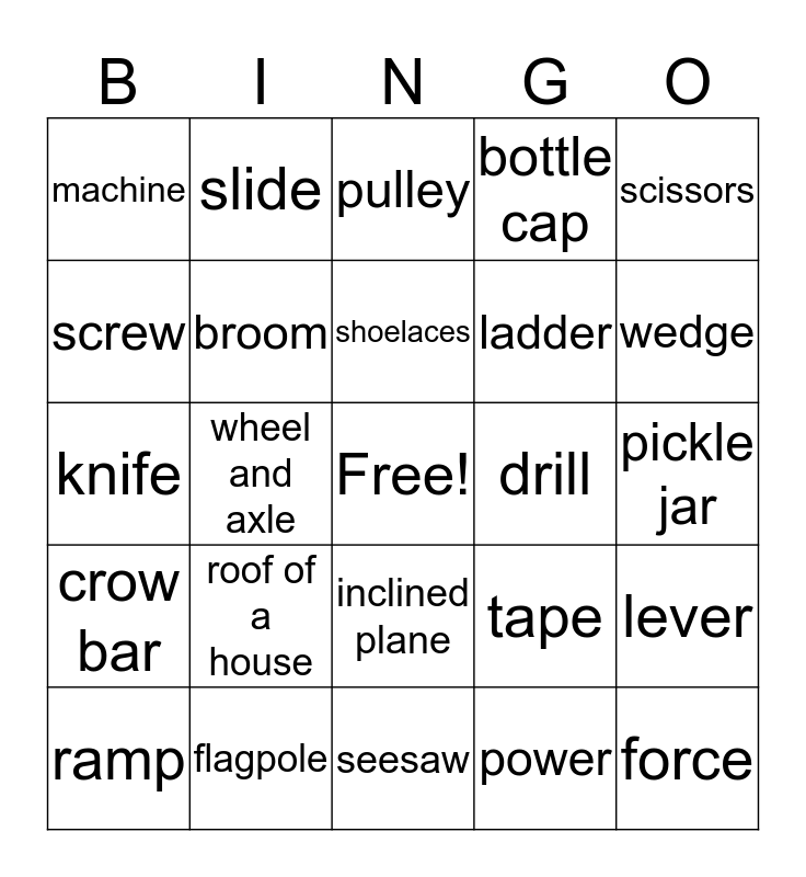 This bingo card has a free space and 24 words: roof of a house, flagpole, shoelaces, ramp, scissors, machine, screw, slide, drill, inclined plane, ladder, knife, tape, lever, broom, power, pickle jar, pulley, wedge, wheel and axle, force, crow bar, bottle cap and seesaw.