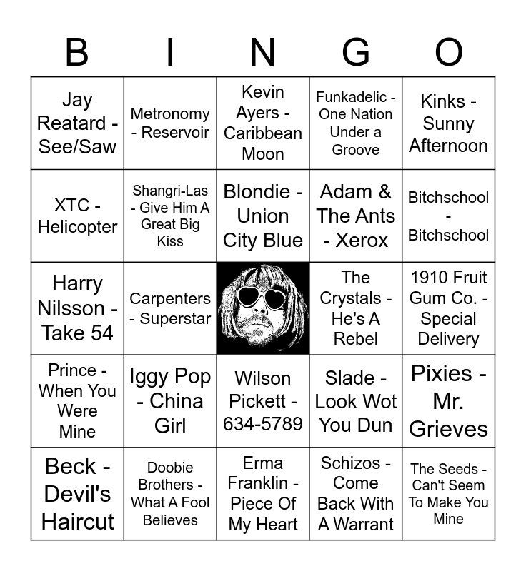 This bingo card has a free space and 30 words: Doobie Brothers - What A Fool Believes, Gilbert O'Sullivan - Alone Again Naturally, Carpenters - Superstar, Rolling Stones - Miss You, Jay Reatard - See/Saw, Kevin Ayers - Caribbean Moon, Shangri-Las - Give Him A Great Big Kiss, Wilson Pickett - 634-5789, The Crystals - He's A Rebel, Erma Franklin - Piece Of My Heart, 1910 Fruit Gum Co. - Special Delivery, The Seeds - Can't Seem To Make You Mine, Schizos - Come Back With A Warrant, The Desperate Bicycles - Cars, Bitchschool - Bitchschool, Spice Girls - Spice Up Your Life, Slade - Look Wot You Dun, Prince - When You Were Mine, Iggy Pop - China Girl, Kinks - Sunny Afternoon, Harry Nilsson - Take 54, Ramones - Don't Come Close, Metronomy - Reservoir, Adam & The Ants - Xerox, XTC - Helicopter, Funkadelic - One Nation Under a Groove, Pixies - Mr. Grieves, Beck - Devil's Haircut, Blondie - Union City Blue and The Whiffs - Shakin' All Over.