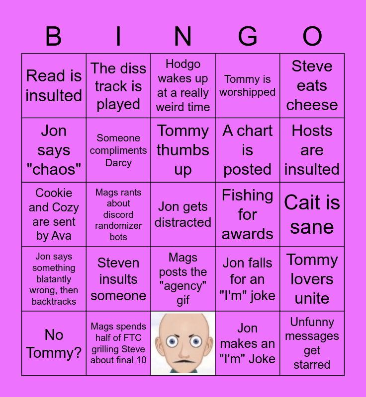 This bingo card has 1 images and 29 words: Mags spends half of FTC grilling Steve about final 10, Koolvivor and/or Selavivor are advertised, Mags rants about discord randomizer bots, Kenzie makes a passive aggressive comment, Read is insulted, Hodgo wakes up at a really weird time, Someone compliments Darcy, Mags posts the "agency" gif, Fishing for awards, Cait is sane, Jon gets distracted, Jon makes an "I'm" Joke, Unfunny messages get starred, Hosts are insulted, Steven talks about his named dms, Jon falls for an "I'm" joke, Jon says something blatantly wrong, then backtracks, Steven insults someone, Steve eats cheese, Cookie and Cozy are sent by Ava, Pidgin posts good art, The diss track is played, A chart is posted, Jon says "chaos", Tommy is worshipped, Tommy lovers unite, No Tommy?, Tommy thumbs up and Tommy thumbs down.