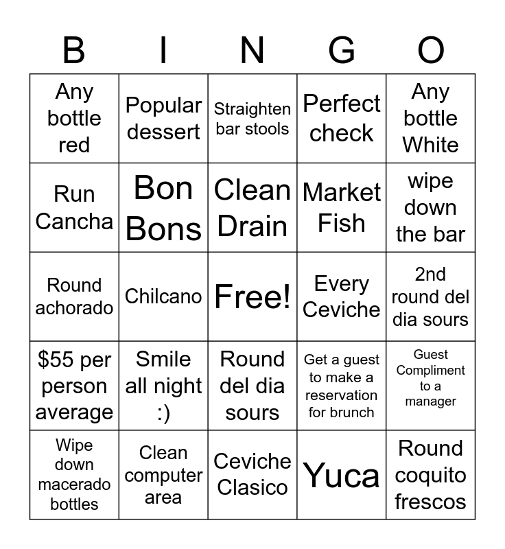This bingo card has a free space and 24 words: Smile all night :), Clean computer area, Clean Drain, Wipe down macerado bottles, Any bottle White, Any bottle red, Run Cancha, Popular dessert, Every Ceviche, Round del dia sours, Market Fish, Round achorado, Get a guest to make a reservation for brunch, Guest Compliment to a manager, Bon Bons, Yuca, 2nd round del dia sours, Straighten bar stools, wipe down the bar, Chilcano, Round coquito frescos, $55 per person average, Perfect check and Ceviche Clasico.
