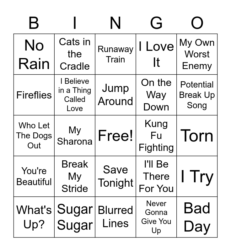 This bingo card has a free space and 50 words: A Thousand Miles, Bad Day, Bleeding Love, Blurred Lines, Break My Stride, Buy U a Drank, Cats in the Cradle, Come On Get Higher, Fireflies, How Bizarre, I Believe in a Thing Called Love, I Love It, I Try, I'll Be There For You, Ice Ice Baby, Informer, Jump Around, Kung Fu Fighting, Misirlou, My Own Worst Enemy, My Sharona, Never Gonna Give You Up, No Rain, On the Way Down, Paralyzer, Play That Funky Music, Potential Break Up Song, Roll To Me, Runaway Train, Save Tonight, Scatman, Send Me On My Way, Shake It, Somebody That I Used to Know, Sugar Sugar, Sweater Weather, Tainted Love, The Final Countdown, There She Goes, Torn, Tubthumping, Two Princes, Unbelievable, Video Killed the Radio Star, What's Up?, Who Let The Dogs Out, Wicked Game, Wipe Out, You're Beautiful and Your Woman.