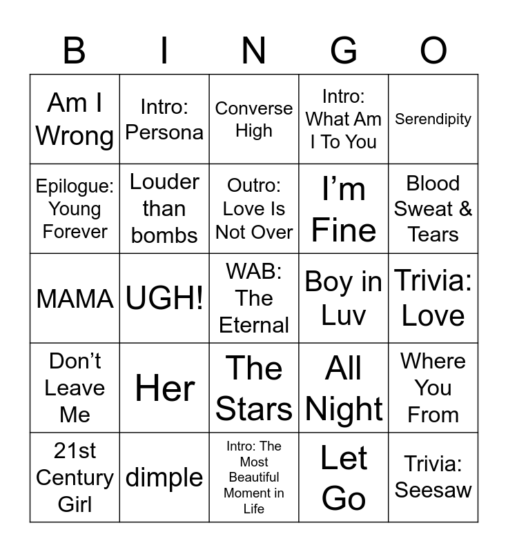 This bingo card has 154 words: Free!, Lights, All Night, A Brand New Day, Dream Glow, Heartbeat, Dionysus, HOME, Make it Right, Mikrokosmos, MIC Drop, Answer: Love Myself, I’m Fine, Epiphany, Trivia: Love, Serendipity, Trivia: Just Dance, Outro: Tear, So What, Anpanman, Airplane pt. 2, Magic Shop, Love Maze, Paradise, 134340, The Truth Untold, Let Go, Don’t Leave Me, Crystal Snow, Go Go, Pied Piper, Best of Me, Come Back Home, A Supplementary Story: YNWA, Not Today, Wishing on a Star, Outro: Wings, Dynamite, Permission to Dance, My Universe, No More Dream, N.O, Boy in Luv, Yet To Come, For Youth, Run BTS, Danger, I Need U, Run, Jamais Vu, Burning Up (Fire), Blood Sweat & Tears, Spring Day, DNA, Fake Love, Idol, Boy with Luv, Stay, Butter, Life Goes On, Intro: Persona, ON, Moon, Trivia: Seesaw, BTS Cypher Pt.3: Killer, Outro: Ego, Her, Filter, Friends, Singularity, 00:00, Euphoria, dimple, Black Swan, Film Out, Fly To My Room, Blue & Grey, Telepathy, Dis-ease, Your Eyes Tell, Stay Gold, WAB: The Eternal, Respect, Inner Child, UGH!, Louder than bombs, My Time, Interlude: Shadow, 2! 3!, 21st Century Girl, Am I Wrong, BTS Cypher 4, Lost, Awake, MAMA, Reflection, First Love, Stigma, Lie, Begin, Intro: Boy Meets Evil, House of Cards, Epilogue: Young Forever, Butterfly, Good Day, Autumn Leaves, Silver Spoon, Ma City, Whalien 52, Intro: Never Mind, For You, Outro: Love Is Not Over, Moving On, Converse High, Boyz with Fun, Dope, Hold Me Tight, Intro: The Most Beautiful Moment in Life, Wake Up, The Stars, Outro: Do You Think It Makes Sense?, 2nd Grade, Look Here, 24/7=Heaven, Embarrassed, Could You Turn Off Your Cell Phone, Interlude: What Are You Doing Now, Rain,, Let Me Know, Hip Hop Phile, War of Hormone, Intro: What Am I To You, Miss Right, Outro: Propose, Jump, Spine Breaker, BTS Cypher Pt.2: Triptych, Tomorrow, Just One Day, Where You From, Intro: Skool Luv Affair, Outro: Luv in Skool, Paldogangsan, Attack on Bangtan, BTS Cypher Pt.1, Coffee, If I Ruled the World, We On, Intro: O!RUL8,2?, Outro: Circle Room Cypher, Like, Interlude, We Are Bulletproof Pt.2 and Intro: 2 Cool 4 Skool.