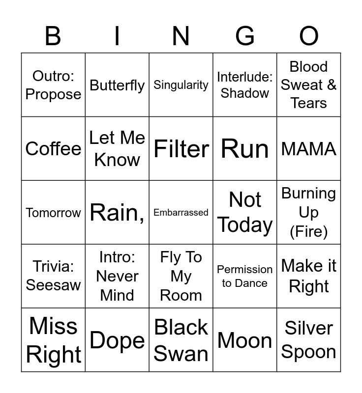 This bingo card has 154 words: Free!, Dynamite, Permission to Dance, My Universe, No More Dream, N.O, Boy in Luv, Yet To Come, For Youth, Run BTS, Danger, I Need U, Run, Jamais Vu, Burning Up (Fire), Blood Sweat & Tears, Spring Day, DNA, Fake Love, Idol, Boy with Luv, Stay, Butter, Life Goes On, Intro: Persona, ON, Moon, Trivia: Seesaw, BTS Cypher Pt.3: Killer, Outro: Ego, Her, Paradise, 134340, The Truth Untold, Let Go, Don’t Leave Me, Crystal Snow, Go Go, Pied Piper, Best of Me, Come Back Home, A Supplementary Story: YNWA, Not Today, Wishing on a Star, Outro: Wings, 2! 3!, 21st Century Girl, Am I Wrong, BTS Cypher 4, Lost, Awake, MAMA, Reflection, First Love, Stigma, Lie, Begin, Intro: Boy Meets Evil, House of Cards, Epilogue: Young Forever, Butterfly, Good Day, Autumn Leaves, Silver Spoon, Ma City, Whalien 52, Intro: Never Mind, For You, Outro: Love Is Not Over, Moving On, Converse High, Boyz with Fun, Dope, Hold Me Tight, Intro: The Most Beautiful Moment in Life, Wake Up, The Stars, Outro: Do You Think It Makes Sense?, 2nd Grade, Look Here, 24/7=Heaven, Embarrassed, Could You Turn Off Your Cell Phone, Interlude: What Are You Doing Now, Rain,, Let Me Know, Hip Hop Phile, War of Hormone, Intro: What Am I To You, Miss Right, Outro: Propose, Jump, Spine Breaker, BTS Cypher Pt.2: Triptych, Tomorrow, Just One Day, Where You From, Intro: Skool Luv Affair, Outro: Luv in Skool, Paldogangsan, Attack on Bangtan, BTS Cypher Pt.1, Coffee, If I Ruled the World, We On, Intro: O!RUL8,2?, Outro: Circle Room Cypher, Like, Interlude, We Are Bulletproof Pt.2, Intro: 2 Cool 4 Skool, Filter, Friends, Singularity, 00:00, Euphoria, dimple, Black Swan, Film Out, Fly To My Room, Blue & Grey, Telepathy, Dis-ease, Your Eyes Tell, Stay Gold, WAB: The Eternal, Respect, Inner Child, UGH!, Louder than bombs, My Time, Interlude: Shadow, Lights, All Night, A Brand New Day, Dream Glow, Heartbeat, Dionysus, HOME, Make it Right, Mikrokosmos, MIC Drop, Answer: Love Myself, I’m Fine, Epiphany, Trivia: Love, Serendipity, Trivia: Just Dance, Outro: Tear, So What, Anpanman, Airplane pt. 2, Magic Shop and Love Maze.