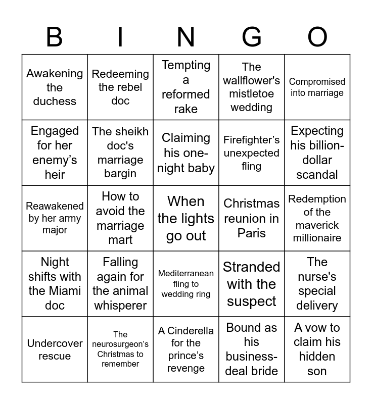This bingo card has a free space and 29 words: Undercover rescue, The innocent's protector in paradise, How to avoid the marriage mart, Unwrapped by the duke, Awakening the duchess, Tempting a reformed rake, The sheikh doc's marriage bargin, Falling again for the animal whisperer, Christmas reunion in Paris, The neurosurgeon’s Christmas to remember, Redemption of the maverick millionaire, A vow to claim his hidden son, A Cinderella for the prince’s revenge, Bound as his business-deal bride, Expecting his billion-dollar scandal, The heirs his housekeeper carried, Mediterranean fling to wedding ring, Night shifts with the Miami doc, Compromised into marriage, Reawakened by her army major, Stranded with the suspect, Snowbound in his billion-dollar bed, Firefighter’s unexpected fling, Engaged for her enemy’s heir, The wallflower's mistletoe wedding, Redeeming the rebel doc, The nurse's special delivery, Claiming his one-night baby and Rags to riches baby.