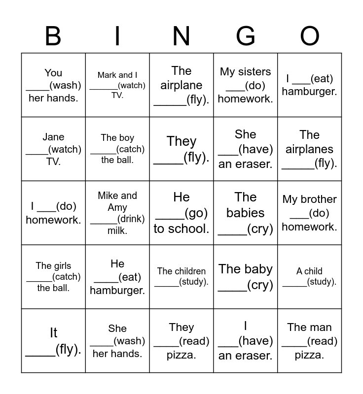 This bingo card has a free space and 24 words: He ____(eat) hamburger., She ____(wash) her hands., They ____(fly)., It ____(fly)., I ___(eat) hamburger., You ____(wash) her hands., Jane ____(watch) TV., Mark and I ______(watch) TV., The babies ____(cry), The children _____(study)., She ___(have) an eraser., I ___(do) homework., The baby ____(cry), A child _____(study)., The boy _____(catch) the ball., I ___(have) an eraser., My brother ___(do) homework., The airplane _____(fly)., The airplanes _____(fly)., Mike and Amy _____(drink) milk., The man ____(read) pizza., The girls _____(catch) the ball., My sisters ___(do) homework. and They ____(read) pizza..