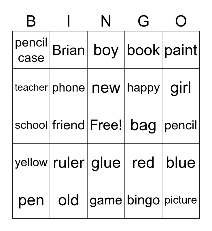 This bingo card has a free space and 24 words: ruler, old, new, pen, paint, pencil case, teacher, Brian, bag, glue, happy, school, red, blue, phone, bingo, pencil, boy, girl, friend, picture, yellow, book and game.