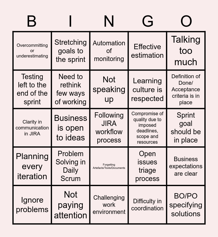 This bingo card has a free space and 24 words: Problem Solving in Daily Scrum, Not paying attention, Not speaking up, Ignore problems, Talking too much, Overcommitting or underestimating, Testing left to the end of the sprint, Stretching goals to the sprint, Compromise of quality due to imposed deadlines, scope and resources, Forgetting Artefacts/Tools/Documents, Learning culture is respected, Clarity in communication in JIRA, Open issues triage process, Business expectations are clear, Need to rethink few ways of working, Difficulty in coordination, Sprint goal should be in place, Automation of monitoring, Definition of Done/ Acceptance criteria is in place, Business is open to ideas, BO/PO specifying solutions, Planning every iteration, Effective estimation and Challenging work environment.