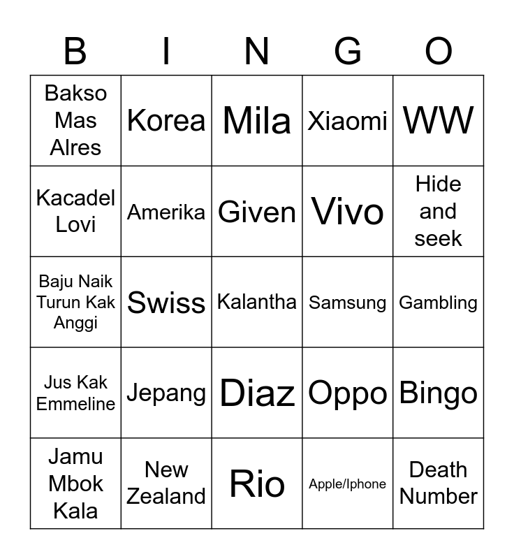 This bingo card has a free space and 24 words: Jamu Mbok Kala, Jepang, Given, Apple/Iphone, WW, Bakso Mas Alres, Korea, Mila, Samsung, Gambling, Baju Naik Turun Kak Anggi, Amerika, Oppo, Bingo, Kacadel Lovi, New Zealand, Rio, Xiaomi, Hide and seek, Jus Kak Emmeline, Swiss, Diaz, Vivo and Death Number.