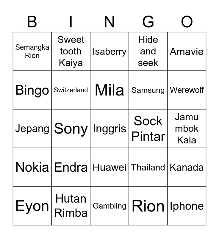 This bingo card has a free space and 24 words: Eyon, Endra, Mila, Rion, Amavie, Semangka Rion, Sweet tooth Kaiya, Isaberry, Sock Pintar, Jamu mbok Kala, Jepang, Switzerland, Thailand, Kanada, Bingo, Hutan Rimba, Gambling, Hide and seek, Werewolf, Nokia, Sony, Huawei, Samsung and Iphone.