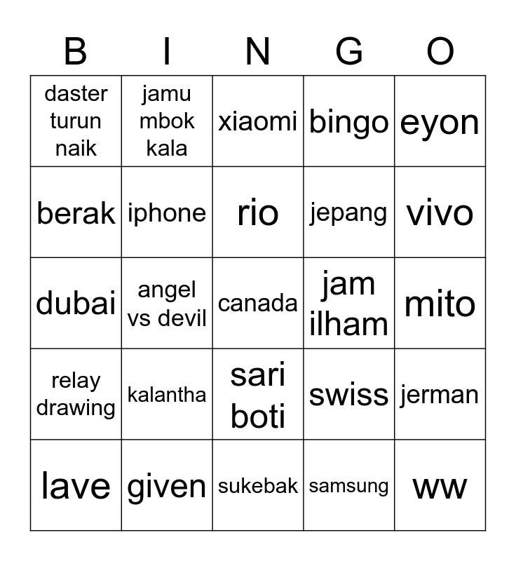 This bingo card has a free space and 24 words: kalantha, given, rio, lave, eyon, daster turun naik, berak, jamu mbok kala, jam ilham, sari boti, jepang, dubai, swiss, jerman, iphone, samsung, mito, xiaomi, vivo, angel vs devil, ww, relay drawing, bingo and sukebak.