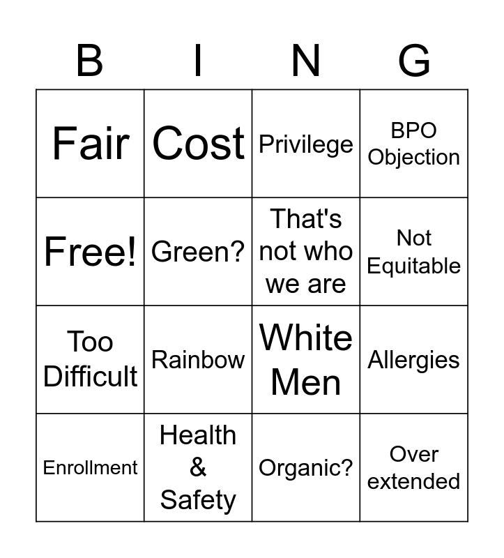 This bingo card has 16 words: Health & Safety, Allergies, Privilege, Fair, Too Difficult, Cost, White Men, Organic?, Free!, Green?, Enrollment, BPO Objection, Rainbow, Not Equitable, That's not who we are and Over extended.