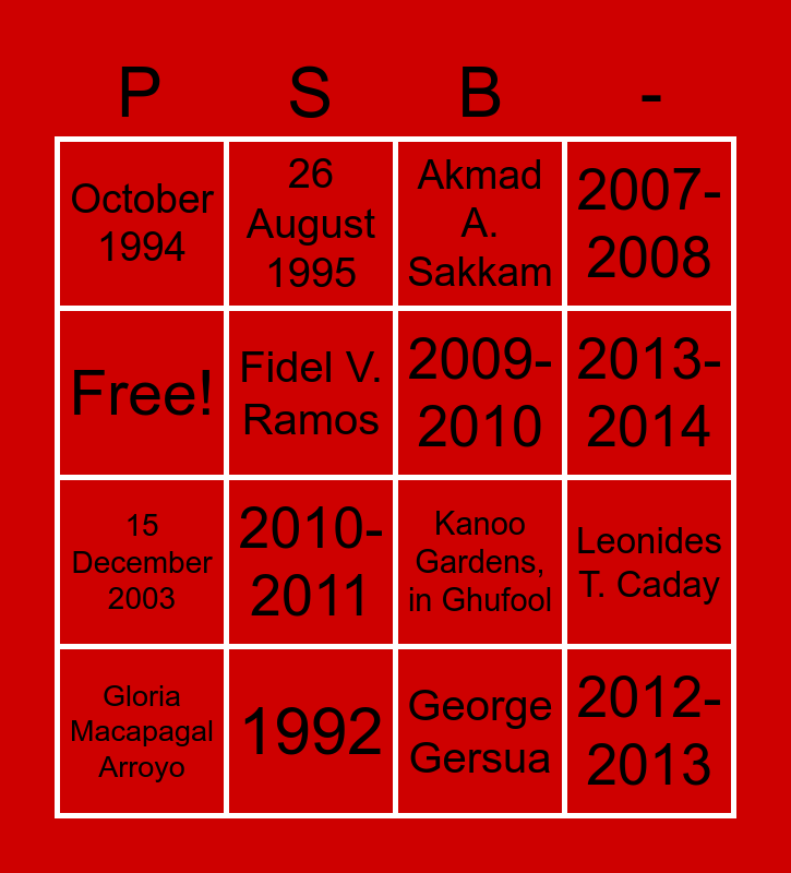 This bingo card has 16 words: 1992, Leonides T. Caday, Akmad A. Sakkam, October 1994, 15 December 2003, 26 August 1995, Kanoo Gardens, in Ghufool, George Gersua, Free!, Fidel V. Ramos, Gloria Macapagal Arroyo, 2007-2008, 2010-2011, 2013-2014, 2009-2010 and 2012-2013.
