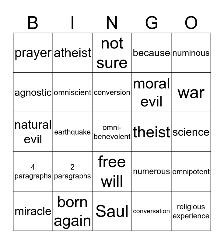 This bingo card has a free space and 24 words: 2 paragraphs, born again, conversion, miracle, numinous, prayer, agnostic, atheist, theist, free will, moral evil, natural evil, numerous, omnipotent, omniscient, conversation, science, not sure, war, earthquake, religious experience, 4 paragraphs, because and Saul.