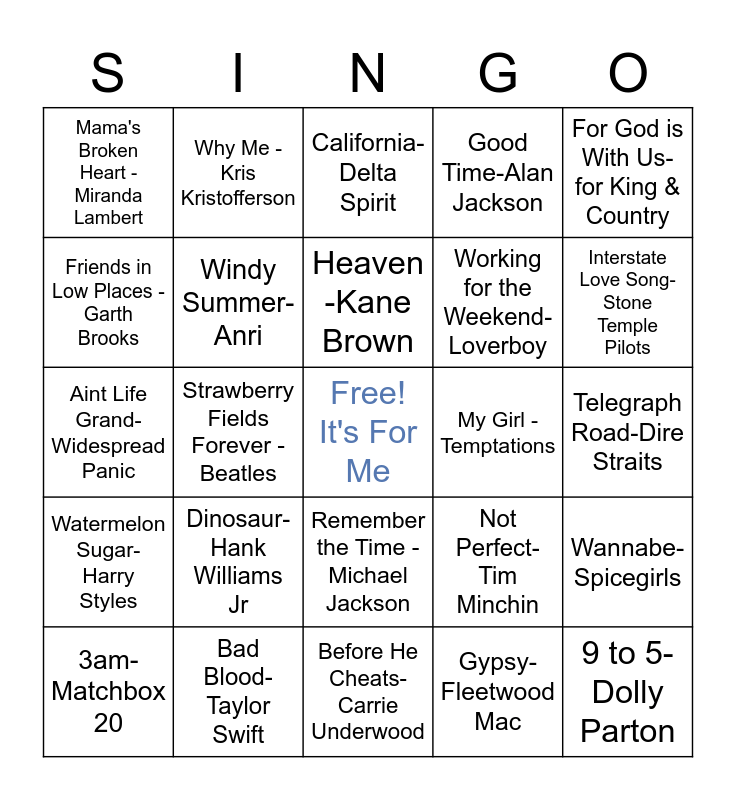 This bingo card has a free space and 25 words: Dinosaur- Hank Williams Jr, Before He Cheats-Carrie Underwood, Heaven -Kane Brown, 3am-Matchbox 20, For God is With Us- for King & Country, Mama's Broken Heart - Miranda Lambert, Friends in Low Places -Garth Brooks, Why Me -Kris Kristofferson, My Girl -Temptations, Remember the Time - Michael Jackson, Working for the Weekend- Loverboy, Aint Life Grand-Widespread Panic, Not Perfect-Tim Minchin, Wannabe-Spicegirls, Windy Summer-Anri, Blind Faith-Chase and Status, Telegraph Road-Dire Straits, California-Delta Spirit, Interstate Love Song-Stone Temple Pilots, Strawberry Fields Forever -Beatles, 9 to 5-Dolly Parton, Bad Blood-Taylor Swift, Watermelon Sugar-Harry Styles, Good Time-Alan Jackson and Gypsy-Fleetwood Mac.