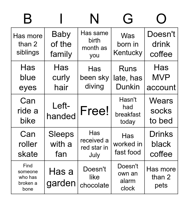 This bingo card has a free space and 24 words: Sleeps with a fan, Has a garden, Has been sky diving, Find someone who has broken a bone, Doesn't drink coffee, Has more than 2 siblings, Has blue eyes, Baby of the family, Hasn't had breakfast today, Has received a red star in July, Runs late, has Dunkin, Can ride a bike, Has worked in fast food, Drinks black coffee, Has curly hair, Doesn't own an alarm clock, Wears socks to bed, Has same birth month as you, Has MVP account, Left-handed, Has more than 2 pets, Can roller skate, Was born in Kentucky and Doesn't like chocolate.