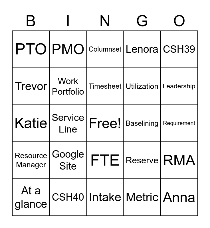 This bingo card has a free space and 44 words: Allocation, Anna, Approval, At a glance, Awesome, Metric, Columnset, Contractor, CSH39, CSH40, Lenora, Baselining, FTE, Google Site, Holiday, Intake, Kasey, Katie, Vivian, Leadership, PMO, Present, Project Manager, PTO, Request, Requirement, Budget, Resource Management_PRM Chat, Reserve, Resource Manager, Resource Portfolio, RMA, Role, Schedule, Service Line, Specialty, Standard Activity, Teams, Timesheet, Trevor, Utilization, Vacation, Work Portfolio and Zach.
