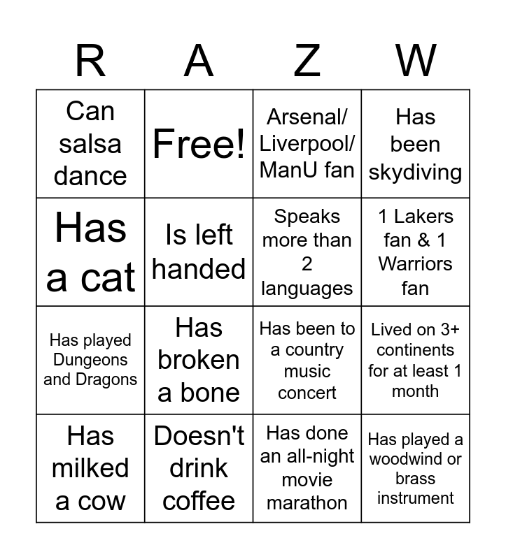 This bingo card has 32 words: Has owned their own business, Is/was a hockey coach, Lived on 3+ continents for at least 1 month, Is a doctor, Has played a woodwind or brass instrument, Speaks more than 2 languages, Has a cat, Uses R or STATA on a regular basis, Free!, Pre-Harvard friend of bride or groom, 1 Lakers fan & 1 Warriors fan, Arsenal/ Liverpool/ ManU fan, Has lived on at least 2 coasts of North America, Currently lives in the place where they were born, Doesn't drink coffee, Undergrad friend of bride or groom, Grad school friend of bride or groom, Has been to a country music concert, Has baked sourdough bread, Lives in BC, Vegetarian or Vegan, Has been to a professional basketball game, Has done an all-night movie marathon, Does not enjoy camping, Has milked a cow, Has been skydiving, Has played Dungeons and Dragons, Is left handed, Can salsa dance, Wears/wore braces, Has ridden a motorcycle and Has broken a bone.