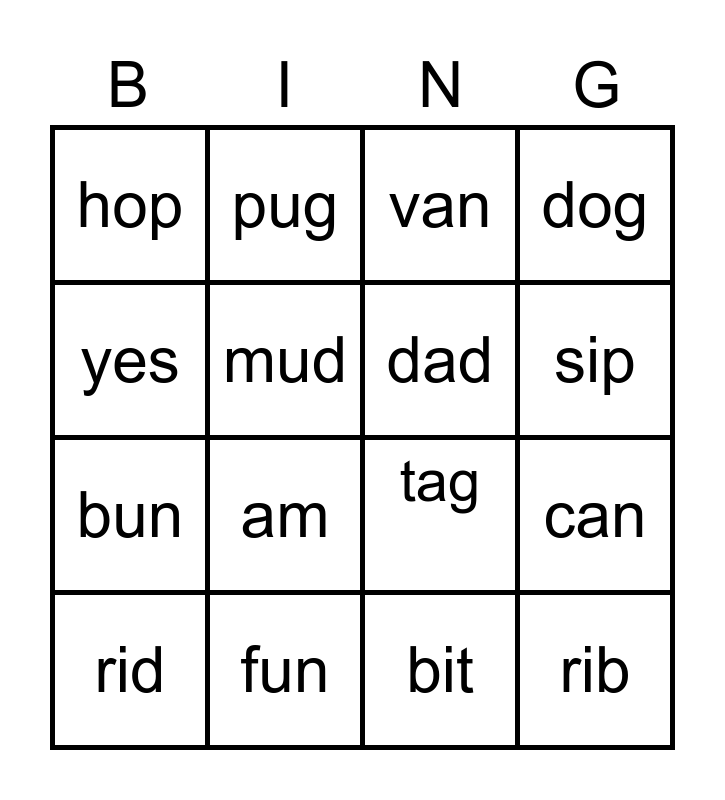 This bingo card has 20 words: can, him, van, zip, rid, yes, fun, hop, bun, pug, am, tag, mud, rib, dad, win, sip, dog, bit and hid.