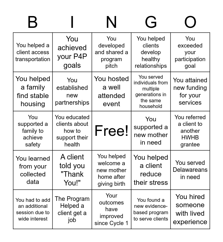 This bingo card has a free space and 24 words: A client told you "Thank You!", The Program Helped a client get a job, You hosted a well attended event, You had to add an additional session due to wide interest, You exceeded your participation goal, You helped a client access transportation, You helped a family find stable housing, You achieved your P4P goals, You supported a new mother in need, You helped welcome a new mother home after giving birth, You served individuals from multiple generations in the same household, You supported a family to achieve safety, You helped a client reduce their stress, You served Delawareans in need, You established new partnerships, You found a new evidence-based program to serve clients, You referred a client to another HWHB grantee, You developed and shared a program pitch, You attained new funding for your services, You educated clients about how to support their health, You hired someone with lived experience, You learned from your collected data, You helped clients develop healthy relationships and Your outcomes have improved since Cycle 1.