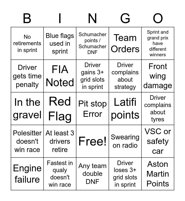 This bingo card has 26 words: Free!, Driver loses 3+ grid slots in sprint, Driver gains 3+ grid slots in sprint, Fastest in qualy doesn't win race, Sprint and grand prix have different winners, No retirements in sprint, Driver gets time penalty, Blue flags used in sprint, Driver complains about tyres, Swearing on radio, Driver complains about strategy, In the gravel, VSC or safety car, Engine failure, Red Flag, Sbinalla, Team Orders, Polesitter doesn't win race, Schumacher points / Schumacher DNF, Pit stop Error, Front wing damage, Any team double DNF, Latifi points, At least 3 drivers retire, FIA Noted and Aston Martin Points.