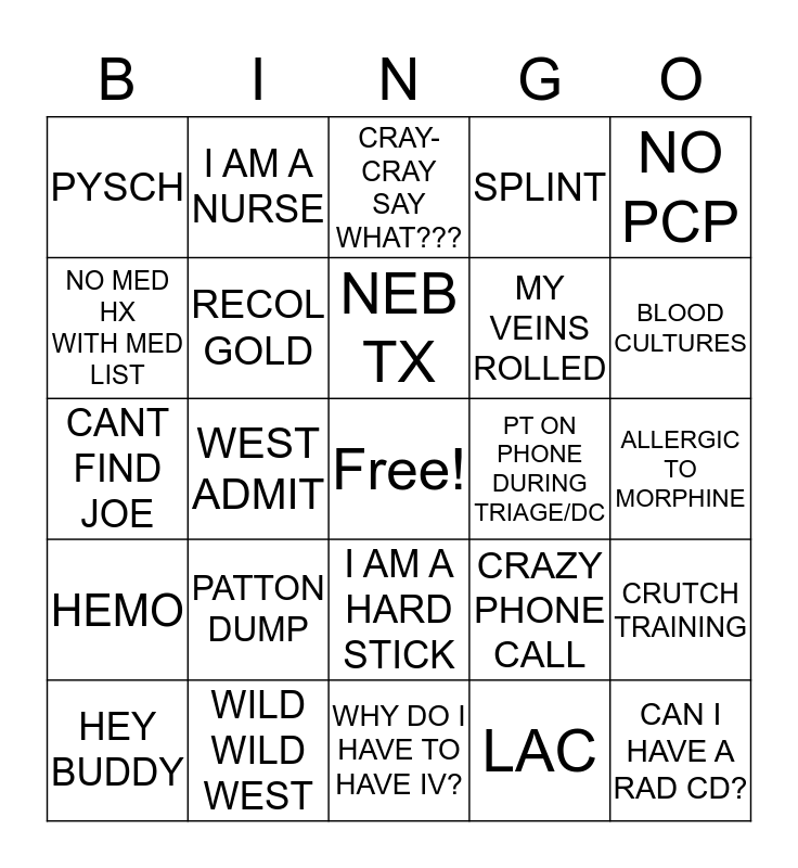 This bingo card has a free space and 24 words: PATTON DUMP, WILD WILD WEST, NEB TX, HEY BUDDY, NO PCP, PYSCH, NO MED HX WITH MED LIST, I AM A NURSE, PT ON PHONE DURING TRIAGE/DC, I AM A HARD STICK, MY VEINS ROLLED, CANT FIND JOE, CRAZY PHONE CALL, CRUTCH TRAINING, RECOL GOLD, LAC, ALLERGIC TO MORPHINE, CRAY-CRAY SAY WHAT???, BLOOD CULTURES, WEST ADMIT, CAN I HAVE A RAD CD?, HEMO, SPLINT and WHY DO I HAVE TO HAVE IV?.