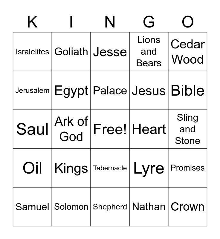 This bingo card has a free space and 24 words: Kings, Solomon, Palace, Samuel, Cedar Wood, Isralelites, Jerusalem, Goliath, Heart, Tabernacle, Jesus, Saul, Lyre, Promises, Egypt, Nathan, Sling and Stone, Jesse, Bible, Ark of God, Crown, Oil, Lions and Bears and Shepherd.