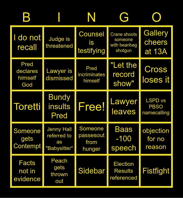 This bingo card has a free space and 24 words: Jenny Hall referred to as "Babysitter", Peach gets thrown out, Pred incriminates himself, Facts not in evidence, Gallery cheers at 13A, I do not recall, Pred declares himself God, Judge is threatened, Lawyer leaves, Someone passesout from hunger, "Let the record show", Toretti, Baas -100 speech, objection for no reason, Lawyer is dismissed, Election Results referenced, LSPD vs PBSO namecalling, Counsel is testifying, Cross loses it, Bundy insults Pred, Fistfight, Someone gets Contempt, Crane shoots someone with beanbag shotgun and Sidebar.