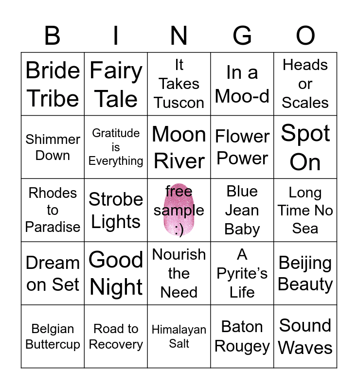 This bingo card has a free space and 175 words: New Light, Rainbow Rhythm, Bikinis & Bellinis, Coming Up Rose Gold, Long Time No Sea, Paint the Town, Party Paws, All an Illusion, Way Rad, Leaf It to Me, Plaid in the USA, Stay a Tile, Rhodes to Paradise, Chrome it Down, Sound Waves, Watermelon Session, Nourish the Need, Home Sleet Home, Holidaze, All Fired Up, Couldn’t Carat Less, Champagne Hour, Gossip & Glitter, What’s the 411, For Sure!, Aquatic Behavior, Tie the Knot, Let’s Meet in Crete, Cannes It!, Lemon Bead Drop, Raspberry Remix, Tangerine Tempo, Seoul Sister, How Swede It Is, Teenie Weenie Santorini, See It to Belize It, Paradise Found, Hibiscus Kiss, Palm Down, You, Me, & Capri, J’adore Glamour, Like Whoa, Firecracker Pop, Comic Relief, Lady Lilac, Deepwater Opal, Prey-monition, Thyme to Go, Red, White, and Belle, We’re Meant to Oui, On Trend Set, Open Arms, Flower Power, Lace the Facts, Toffee Nut, Just a Gleamer, Viper Active, Nail Strengthener, Cuticle Oil, Polish Remover, Dream on Set, Bride Tribe, Solar Flare, Mermaid You Look, Purr Diem, Free for All, Lean Mean Tangerine, Pop the Bubbly, Piqued my Luminosity, Road to Recovery, French Meet Me in Paris, Hand Lotion, Heads or Scales, How Do You Hue?, Sleep Tight, Anything Froze, Shimmer Down, Firework Glow, French City of Love, A Roar-ing Time, Hold Me Close, Perfect Confection, Flake My Day, Tulum It May Concern, Let Freedom Bling, Made in Milan, Precious Gift, In a Moo-d, Hue Can Do It!, Sunflower Child, Munich Mulberry, Fairy Tale, Shockwave, Glad You Camo, High Voltage, Gratitude is Everything, Blue Jean Baby, Aberdeen Aubergine, Kilowatt, Swiss and Tell, Check Yourself, Belgian Buttercup, Baton Rougey, Good Night, Chilladelphia, Over the Moon, Oslo & Steady, Chelsea Ya Later, Call Your Blush, Bloomer Has It, Lavish Lavender, Grow with the Flow, Are You Madrid-ing Me?, Back in Tile, In Another Galaxy, Spot On, Leaf of Faith, Under the Stars, Love Shack, Cherry Float, Think You're Slick?, Exes & Ohs, How You Dune?, For the Cause, Into the Sunset, Raise the Roof, Fancy Pants, Space Case, Keep Calm & Chevron, Have a Ball, Key West is Best, Glitter Days Ahead, Czech Me Out, Cran-tastic, Deep Diving, She’s a Trooper, Fort Worth It, Strobe Lights, Tokyo Lights, Teal We Meet Again, Sorry Not Quarry, Out of Quartz, Moon River, Sahara Jewel, Amazing Greige, Giza Sands, Aspen Sky, Clear as Day, Soho-ver It, Beijing Beauty, Night Terror, New York Minute, Glittersweet, At the Plaza, Manchester Mauve, Caribbean Coral, Himalayan Salt, Greeking Out, Havana Honey, Game of Stones, Swiss & Tell, A Pyrite’s Life, Berlin It to Win It, Pebble Rebel, London Calling, Cape Coral, Jadey Business, Midnight in Manhattan, Coming in Hot, It Takes Tuscon, Take Pride (oos), Young at Heart Set (oos), Dose of Mykonos (oos), A World to Sea (oos) and Make Believe Set (oos).