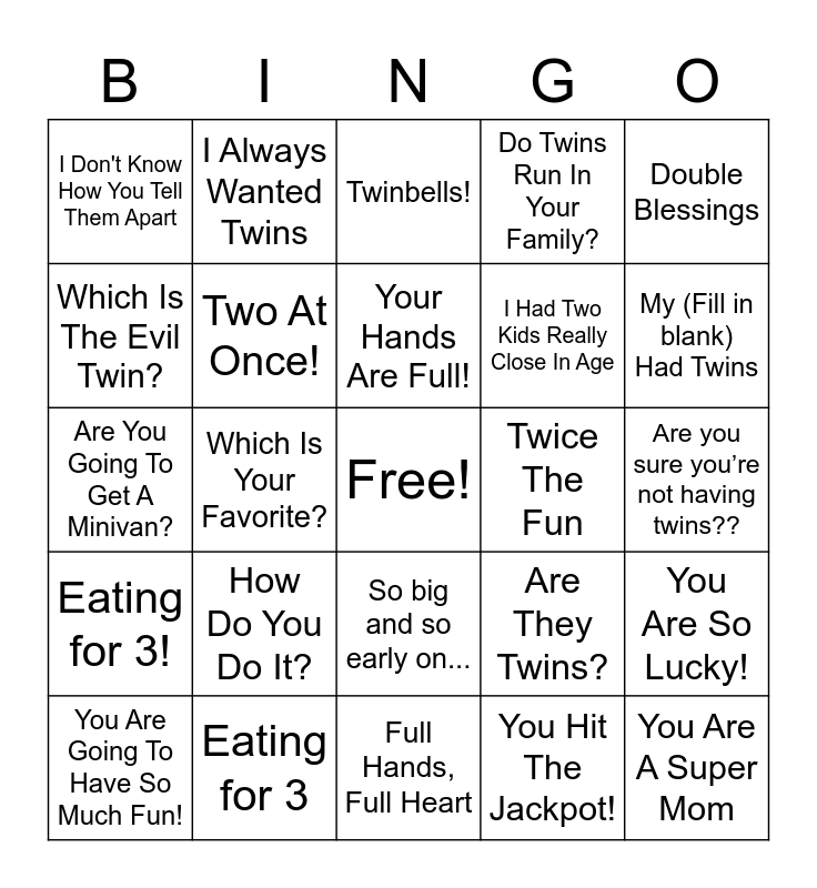 This bingo card has a free space and 52 words: Double Trouble, You Are A Super Mom, Two of Everything, Full Hands, Full Heart, How Do You Do It?, I Know Someone With Twins, I Always Wanted Twins, Can I Have One?!, Which Is The Evil Twin?, Who Is Older?, Two At Once!, Are They Identical?, You Are So Lucky!, Are They Twins?, Twinfants, Better You Than Me!, Your Hands Are Full!, Twice The Fun, Double Diapers, Double Blessings, Which Is Your Favorite?, You Hit The Jackpot!, I Don't Know How You Tell Them Apart, I Had Two Kids Really Close In Age, Do You Always Dress Them The Same?, Wow!, They Are So Beautiful, Just Wait Until They Are Toddlers, Two For The Price Of One!, My (Fill in blank) Had Twins, When One Cries Does It Wake The Other?, I Bet You Don’t Sleep!, Do Twins Run In Your Family?, Two Peas In A Pod!, Twin A and Twin B, Twinning!, Twinbells!, Eating for 3, Twibell Twins, Oh my! You are so big., How do you carry that around all day?, Sleep now, you'll never sleep again!, Are you sure you’re not having twins??, Eating for 3!, Did you grow again?, So big and so early on..., Are You In Pain?, Have Your Fun Now…, Are You Going To Get A Minivan?, You Still Have A Long Time To Go… (regarding to size), This Will Be The Best Thing That’s Happened To You!, You Are Going To Have So Much Fun! and So Chaotic, So Amazing.